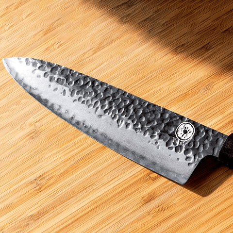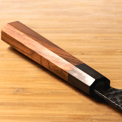 • Our knives all have a distinctive "Kurouchi" or blacksmith's finish. This dark and textured finish is a natural result of the forging process.